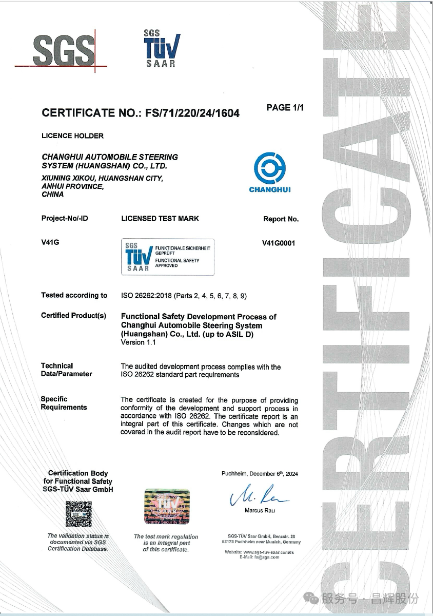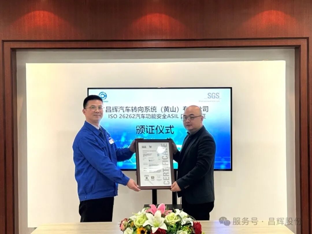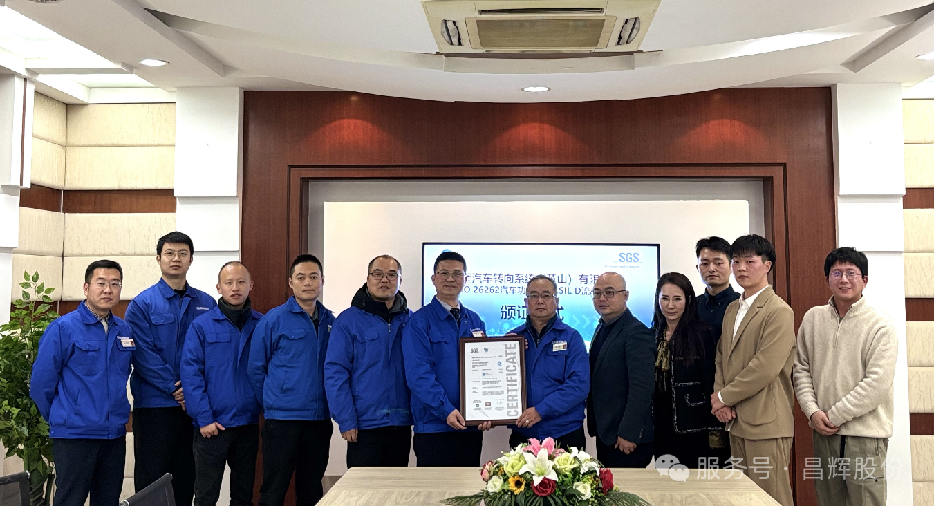 Recently, SGS, a globally recognized testing, inspection and certification body, awarded the ISO26262:2018 Functional Safety ASIL D Process Certification to Changhui Automotive Steering System (Huangshan) Co., Ltd. (hereinafter referred to as "Changhui Steering"). This certification signifies that Changhui Steering has established a product development and management process system compliant with ASIL D, the highest level of functional safety, in accordance with the requirements of the ISO26262:2018 standard.